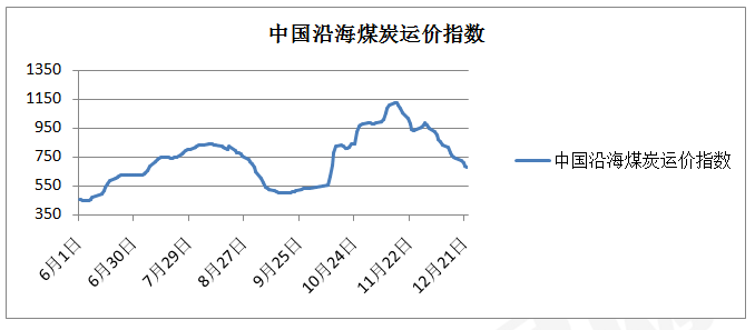 从图中可以看出,海运费价格继续下跌。市场户订船需求明显减少,煤炭海运市场下行走势明朗化,船东挺价意愿松动,各航线报价均出现大幅向下补跌的情况,导致煤炭海运价格加速回落。因多数内外兼营船舶均在国内,在订船需求减少的背景下,船舶运力供应略显过剩,煤炭海运市场短期难以回暖。加之临近年底,订船需求进入传统淡季,煤炭海运价格或将继续下行。