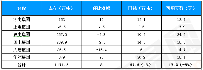 表2:六大电力集团(部分电厂)煤炭库存及日耗煤情况(2016.12.22)