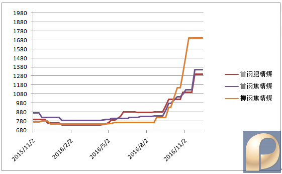 二、 下游情况 1.钢厂采购价: 表2:2016.12.16代表性钢厂炼焦煤到厂价