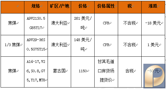 山西: 本周(12.12-12.16)山西地区焦煤普遍暂稳。市场上本周降价传言较多,恐山西焦煤价格不保。 据称,从上周开始,山西地区部分产地焦煤价格出现了松动,临汾地区低硫主焦由于出货转弱,对部分客户下调了30元。 河北:河北地区焦煤也有降价传言,据称,河北邯郸某焦企对所有采购煤种试探性下调50元,部分供应商已经同意调价。 陕西:陕西则相反,韩城瘦精煤目前售价1000元/吨,进入12月供货商压货等涨,价格上涨幅度较大。 分析及预测: 本周(12.12-12.16)焦煤主产地价格普遍维稳,但传降声逐渐加大。随着产能释放,资源紧张的局势得以改善,供求关系正在从增加供应量的方面缓解,甚至近来下游需求量降低,有再次过剩的迹象。目前综合来看,焦煤价格弱势面增加,年前价格恐有所回落。 2.国外 表2. 国际炼焦煤主流价格