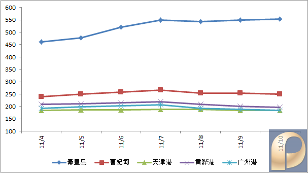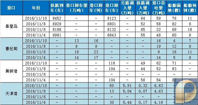 一,总评: 动力煤方面:本周全国动力煤市场价格稳中有涨,环渤海动力煤价格指数报收于606元/吨,环比下行1元/吨,结束了此前连续十八期上涨的局面。 炼焦煤方面:本周国内炼焦煤市场价格持续走强,其中山西部分低硫主焦煤出厂价格已接近1500元/吨。无烟煤方面:本周国内无烟喷吹煤市场坚挺运行,部分主流地区大矿价格上扬,市场交投氛围良好。焦炭方面:本周焦炭市场价格持续攀升,成交情况良好。 二,港口库存及调度: 本周,环渤海地区气象条件再度恶化,各港均出现长时间封航,装船量被迫掉头回落。而受益于铁路运力提升释放,多数港口调进量进一步增多,并远超过装船量,港口库存迅速积压走高。 秦港方面,本周日均装船量46.6万吨,较上周下降5.3万吨;日均调进量60.7万吨,较上周上涨6万吨。截至11月10日,秦港存煤454万吨,较上周同期增长100万吨,锚地船76艘。 曹妃甸港方面,本周日均装船量14.4万吨,较上周下降1.9万吨;日均调进量14.9万吨,较上周下降0.5万吨。截至11月10日,曹妃甸港存煤251万吨,较上周同期增长12万吨,锚地船4艘。 广州港方面,截止到11月10日,港口煤炭库存为184.26195.79吨,其中新沙公司108万吨,西基公司69万吨,新港公司7.26万吨,库存环比上周下降6%。见下面图一及表一: 图1 五大港口本周库存情况