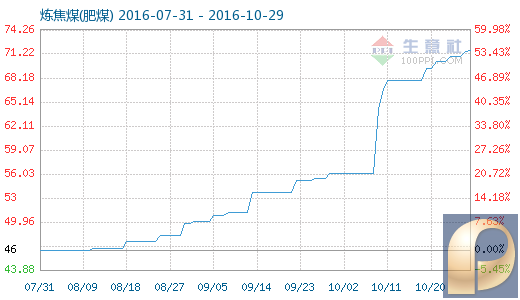 10月29日炼焦煤(肥煤)商品指数为71.73,与昨日持平,较周期内最高点102.38点(2011-11-02)下降了29.94%,较2016年01月28日最低点39.38点上涨了82.15%。(注:周期指2011-09-01至今)