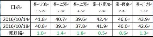 本报告期(2016/10/15-2016/10/18),沿海煤炭运输市场运价结束此前的跳涨走势,开始出现小幅下降至1000点以内,各航线运价均有不同程度的下跌。10月18日,海运煤炭运价指数OCFI报收980.57点,期环比下行2.50%。分子指数来看,华东线指数报收1032.00点,期环比下行2.39%;华南线指数报收808.39点,期环比下行2.96%。 分航线船型平均运价具体情况如下表(单位:元/吨):