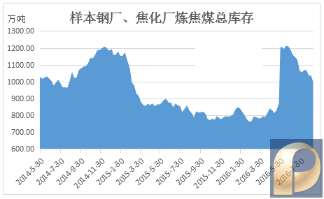 据被监测钢厂和焦企的焦煤库存数据显示:截止9月9日,全国50家样本钢厂焦化及100家独立焦化企业炼焦煤库存总量为997.97万吨,环比上期1035.06减少37.09万吨,周环比降3.58%。 (注:被监测对象为全国七大区域50家典型钢厂和100家独立焦化厂,50家本钢厂中有37家钢厂自带焦化企业,钢厂以大中型规模为主,独立焦化厂以当地代表焦化企业为主。100家样本焦企总产能为17236万吨,其中东北378万吨,华北7688万吨,华东4305万吨,华中1090万吨,西北2500万吨,西南1275万吨。)