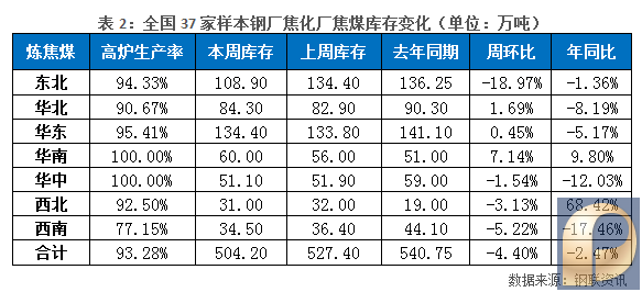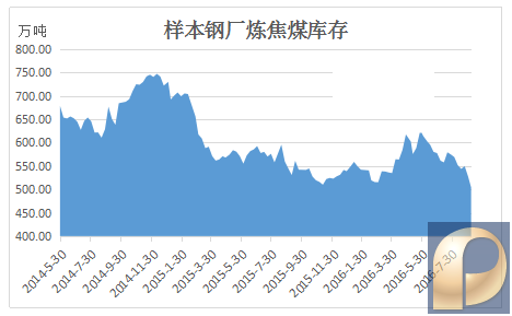 样本焦化厂炼焦煤库存为493.77万吨,环比上期507.66万吨,减少13.89万吨,环比降2.74%。