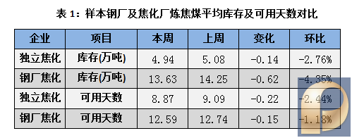 钢厂炼焦煤库存: 本期钢厂焦煤库存继续下降,主要原因仍然是交通受阻,发运不畅,加之整体资源紧缺态势有增无减。钢厂高炉开工率一直处于高位水平,短期看焦煤需求依然旺盛,补给积极性不减,然而,补库的效果却不佳,库存可用天数继续下降,更加反映出资源紧张。虽然276微调会议已开,但是距离大批量生产补库带来的市场效应还有时间差,预计后期资源紧缺态势会有缓解,并且随着交通的逐步畅通,后期钢厂补库会更为便利。