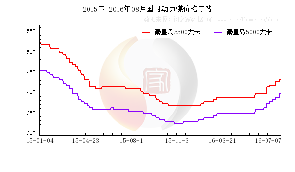 国内市场:本周动力市场强势运行,大型煤企上调了8月份下水煤的价格,其中,Q5500大卡上涨18元/吨,其他热值的在11-25元/吨。产地限产、全国出现大范围高温天气令下游需求旺盛,致环渤海港口动力煤库存不断下降,秦皇岛港电力煤库存已降到至少六年来的最低。煤炭货紧价扬,最近一期环渤海动力煤价格指数报收于436元/吨,较上期上涨6元/吨,连续六周上涨。下游需求,截止8月3日,沿海主要电企合计日耗煤量至71.5万吨,周环比均值小幅回落,六大电厂库存1127.7万吨,变动不大,平均可用天数降至15.8天,略有回升,表明电煤资源依然偏紧。