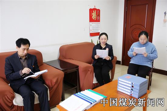 王楼煤矿纪检监察人员正对照《全省纪检监察干部应知应会知识》相互提问。