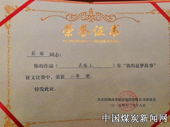 【本网讯】12月18日上午,湖南省煤业集团公司团委在湘煤大学举行了 “我的追梦故事”征文比赛颁奖仪式,街洞矿业公司团委书记彭瑶撰写的参赛作品《在路上》获得了这次征文比赛二等奖。