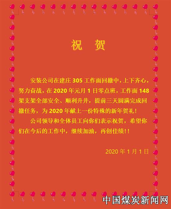 “安装公司在建庄矿业305工作面回撤中,上下齐心,努力奋战,在2020年元月1日零点班,工作面148架支架全部安全、顺利升井,提前三天完成回撤任务。”为什么能提前完成工作任务呢?笔者通过电话采访该公司安装公司经理秦永平得知,203、305工作面同时回撤,人员严重不足,这就是现实,怎么办?为了克服人员不足带来的影响,秦永平亲自挂帅,要求区队管理人员与职工同上同下,班组长发扬“领头雁”作用。为了确保工程按期完成,一方面出台全勤奖制度,同时增加运输车辆,另一方面,倡导煤矿人特别能战斗、特别能吃苦、特别能奉献的蒲白精神。“我已经连续三个月没有休假了”在电话采访时秦经理这样说到。2020年,该公司积极推行“走出去”目标管理模式,在秦永平的带领下,他们用坚守和智慧向2020年元旦送上一份特殊的贺礼。