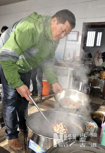 午饭时,“牧民服务队”的“队长”巴特尔在塬林煤矿食堂看到大家忙不过来时,上前帮忙盛菜(11月20日摄)。一壶又一壶滚烫的奶茶送到井下200多米处救援人员跟前;一盘又一盘热气腾腾的饭菜源源不断地摆上餐桌,300多人的流水席随时保证供应。4天来,一支“牧民服务队”主动从20公里外的草原赶到内蒙古塬林煤矿食堂,为救援人员提供热情周到的后勤保障。新华社记者 贾立君 摄