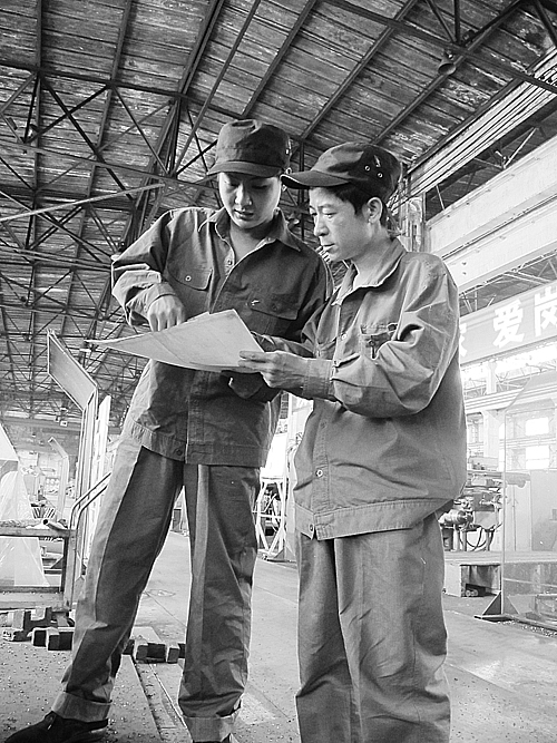 图为师傅(右)和徒弟正在研究图纸时的情景。