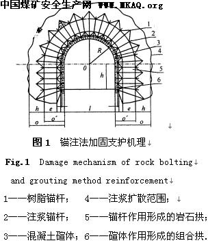 锚注法加固方案是在锚喷或混凝土砌碹支护基础上,增加长短注浆锚杆、树脂锚杆、底板锚杆等,并进行壁后注浆,以增加支护结构的整体性和承载能力.该方案既具有锚杆支护的柔性与让压作用,又具有砌碹的刚性支护作用,组成了多种支护体系以共同维持巷道硐室的稳定,但其关键技术仍在于锚注法支护技术.注浆锚杆集锚固与注浆为一体,利用注浆管兼做锚杆,通过向注浆锚杆注入浆液,封堵围岩裂隙,隔绝空气,防止围岩风化及围岩被水浸湿而降低强度.注浆锚杆注浆后将松散破碎的围岩胶结成整体,从而提高岩体的粘聚力、内摩擦角及弹性模量.注浆后使碹体壁后充填密实,从而避免碹体出现应力集中点而首先破坏.注浆使端头锚固锚杆变为全长锚固,形成可靠有效的组合拱.浆液充填围岩裂隙,配合锚喷或锚杆砌碹支护,形成一个多层有效组合拱支护结构,即碹体组合拱、锚杆压缩区组合拱、浆液扩散加固拱及碹体与压缩区之间的浆液加固拱.多层组合拱既扩大了支护结构的有效承载范围,又提高了支护结构的整体性能和承载能力(如图1所示).