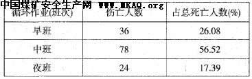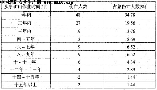 从表二可分析出:从事矿山作业一年内(或刚入矿山人员伤亡人数为48人,占34.78%,死亡率较高,其次是二年内矿龄内的作业人员,随着矿龄的增加,其死亡率在下降。究其原因,主要是新人矿山人员对适应矿山采掘工作面作业环境、操作技能、自保安全常识较差。