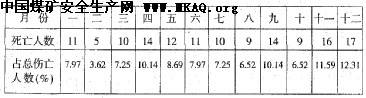 在不同季节内冒顶、坍塌事敌发牛情祝如下: