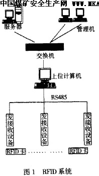 硬件系统分井上计算机系统与井下RFID系统。RFID系统包括RFID卡、接收天线、阅读器和标识卡等组成,结构如图1所示。