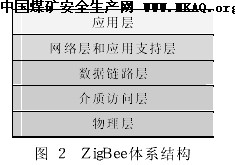 ZigBee体系结构如图2所示。其中物理层、介质访问层和数据链路层基于IEEE802.15.4无线个人局域网(WPAN)标准协议; ZigBee在IEEE802.15.4标准基础之上建立网络层和应用支持层,包括巨大数量节点的处理最大节点数可以达到65 000[3]个) 、ZigBee设备对象、用户定义的应用轮廓以及应用支持层等。应用层则由用户根据需要进行开发。