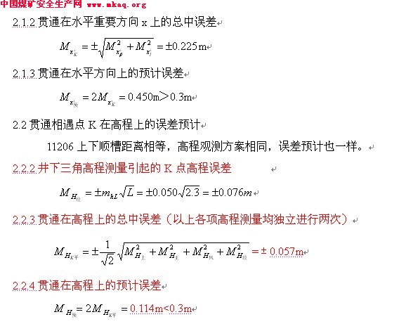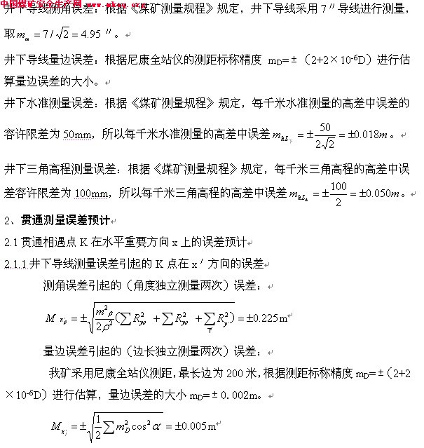 从以上误差预计结果可知:在水平重要方向上和高程上均未超过允许的贯通偏差值,说明所选定的测量方案和测量方法能够满足贯通精度要求。通过贯通预计可以看出,引起水平方向上的贯通误差的诸多因素中,陀螺定向和井下测角是最主要的误差来源。而高程预计误差为±0.114m,小于容许的贯通高程偏差值,说明目前的高程测量仪器及其方法所达到的精度,足以保证本次贯通的要求。