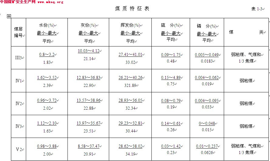 各煤层的稳定性及可采煤层特征见表1-2,煤质特征见表1-3。