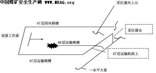 1990年七台河矿务局桃山矿七采区煤与瓦斯爆炸事故。事故分析认定,爆炸前4h,矿井事故停电,七采区一水平68层顺槽掘进工作面瓦斯积聚,大巷送电后,架线电机车牵引一列车驶来,掘进工作面瓦斯爆炸。爆炸波到达大巷时,受到列车阻挡,冲击波反射冲击煤仓下口,煤仓开口放煤堵塞大巷,爆炸波转向采煤工作面。这次事故共造成33人死亡。见图1。