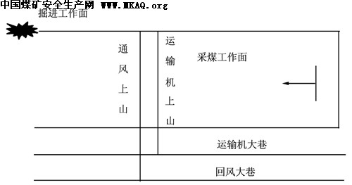 1997年5月28日抚顺矿务局龙凤矿煤与瓦斯爆炸事故。情况类似。也是矿井事故停电4h,掘进工作面瓦斯积聚。爆炸发生时,这个掘进工作面没有电,也没有人作业。由于采煤工作面就在这个掘进工作面的对面,爆炸波通过采煤工作面。这起事故造成68人死亡。见图2。