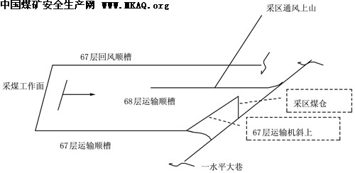 案例一只要做两件事。第一,68层顺槽掘进工作面在煤仓之后拉门;第二,拉门以后,先掘通风上山,贯通以后顺槽再正常掘进。见图3。这样,即使掘进工作面发生爆炸,也不会波及到采煤工作面。