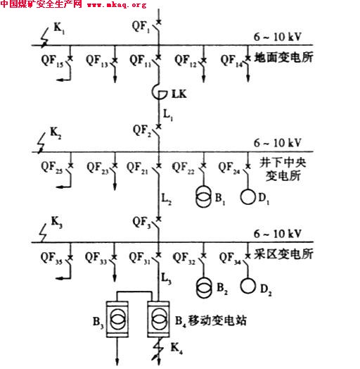 ???? 典型的井下高压供电系统是一个单侧电源三级线路供电系统,如图 1 所示。