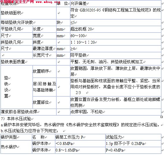 6)本体就位后,应检查锅炉出水法兰的标高是否与图纸相符,否则用垫铁找平。垫铁安装应符合下列要求: