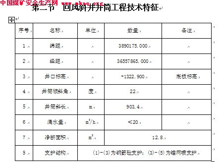 5°07'45〃-35°10'00〃,井田南北宽约4.2公里,东西长约6.5公里,井田面积24.75平方公里。矿井设计年生产能力为120万吨,该矿井采用斜井开拓方式。设主斜井井筒、副斜井井筒及回风斜井井筒。