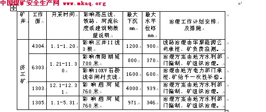 2、其它三下压煤问题:除村庄压煤外,2004年济三煤矿涉及的三下压煤中地表还有三井Ⅱ线、南阳湖堤、泗河堤以及10KV石桥线辛闸村支线,具体情况及治理方案见下表: