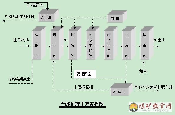 经过上述工艺比较,本污水主要工艺过程设计如下:矿渣废水通过沉淀后进入调节池,生活污水通过机械格栅拦污后的污水直接进入调节池,设置调节池的目的调节污水的水量和水质,为防止悬浮物在调节池内沉淀,在调节池底布有穿孔曝气管,采用间隙曝气。