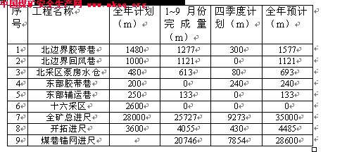 1、生产掘进率:1~9月份完成34.26 m/万吨,预计全年35 m/万吨。