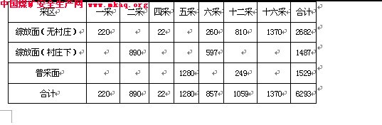 根据目前掌握的地质情况,各采区可布置工作面的煤炭储量见下表:(本表为目前生产采区及准备采区储量表)