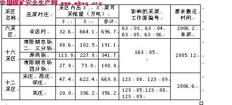 1、村庄压煤问题:村庄压煤是今后影响矿井正常接续的一个较为重要的问题。由于矿井产量增幅过大,加之地质条件差,单面储量较设计减少,造成投产工作面数量大幅增加,投产初期规划的工作面数量严重不足。因此对村庄压煤问题的处理工作滞后,对接续产生了较大影响。由于二采区受村庄影响严重,整个采区均有村庄压煤,搬迁难度大,因此今后五年内不做接续规划。而八采、十八采等西部采区短期内无法开拓到位。因此2004及后五年接续中,矿井生产及准备采区仍需集中在一、四、五、六、十六和十二采区。而这些采区中,主要存在的压煤村庄为六采区、八采区的辛店村;十二采区的朱庄、宋庄、邬庄、高庄四个村庄;十六采区的南阳湖农场。辛店村跨六采、八采压煤2044.5万吨,因六采区是我矿目前投产的主要采区,八采区是下步矿井西区重点接续采区,因此该村的搬迁工作应及早列入日程;十二采区计划2006年投产,因此,其上覆的四个村庄要求于2006年下半年必须完成搬迁工作。目前十二采区四个村庄搬迁报告已于六月报公司,尚未批复。具体压煤情况见下表。