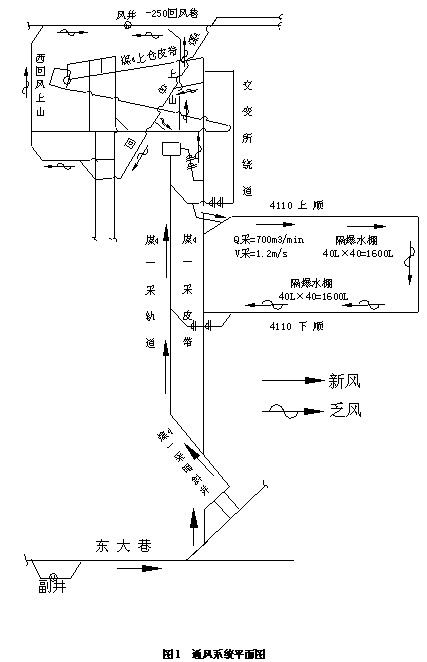 回风:工作面→4110下顺→煤4一采皮带上山→煤4总回风巷→23°上山→250总回风巷→风井。