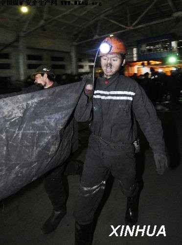 救援人员抬着被困矿工升井。 (人民网记者鲍丹 摄)
