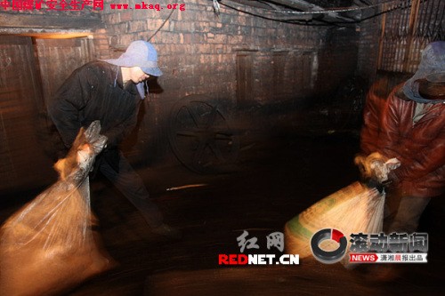 (救援人员往煤矿内搬运黄土。图/潇湘晨报滚动新闻记者 邵骁歆)