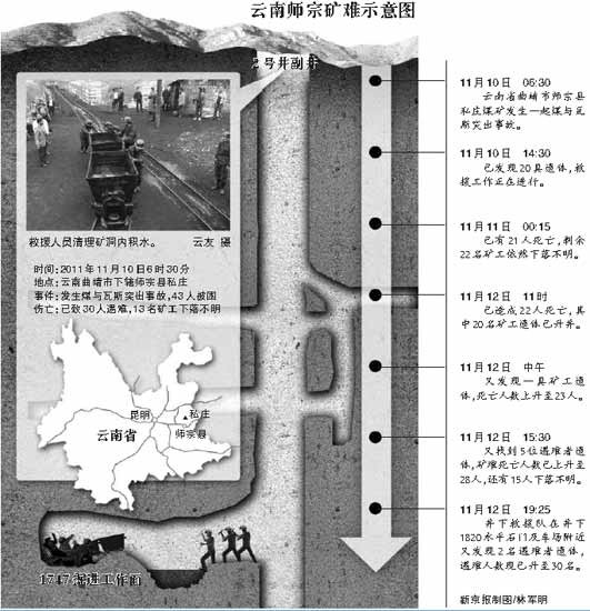 本报综合报道12 日,云南省师宗县私庄煤矿煤与瓦斯突出事故搜救工作进入第三天。截至12 日19 时25 分,已发现30 名遇难者遗体,仍有13 人下落不明。