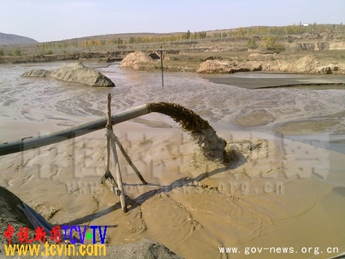 2011年12月12日上午,《中国环境观察》在山西省大同市的天镇县境内,发现该县米薪关镇的张辛窑村,有一条河道紧挨着通往河北省阳源县的公路,在公 路的西侧,河道内满是堆积沉淀的淤泥和泥沙,而不远处的河岸边上,却有三根黑色的橡胶管,管口超天,正在喷泄着汹涌的泥浆。