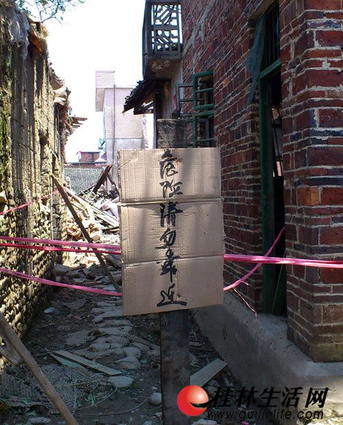江头新村爆炸废墟前的一块安全警示牌,但对于这里的村民来说,最大的隐患或许并不是已经发生爆炸的这片废墟。