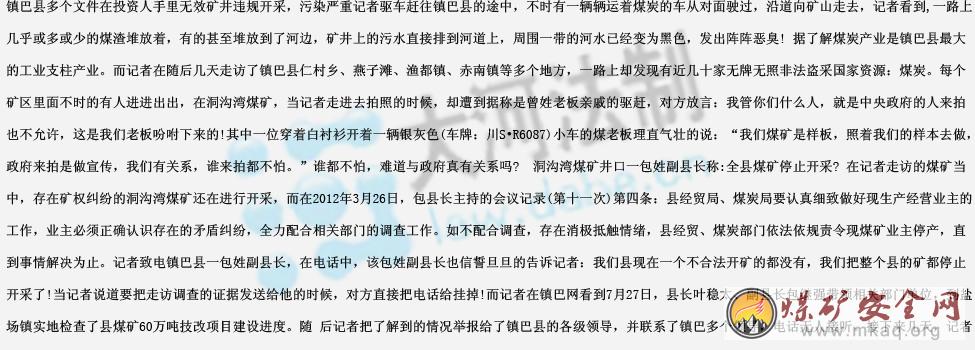 据了解,国家安全监管总局、国家煤矿安监局7日通报了近期几起煤矿迟报瞒报事故。通报指出,几起事故反映出部分矿主及相关人员无视国家法律法规、无视矿工生命安全,性质恶劣、影响极坏。通报要求严厉打击事故迟报、瞒报、谎报行为。近日,记者接到报料人的报料称镇巴县存在多处无牌无照非法开采的煤矿,而政府有关部门却不闻不问?记者对事件进行了调查。据了解,煤炭产业是镇巴县最大的工业支柱产业。2011年企业生产原煤135万吨,销售114万吨,实现企业总产值5.3亿元,营业收入4.3亿元,缴纳国、地两税5180万 元,占整个全县财政收入1.24亿元的42%,缴纳各种政策性规费1770万元,实现利润2315万元,解决就业人员2658人,就业人员获得劳务收入 1.8亿元。为全县农民增收、财政收入增长和县域经济发展做出了较大贡献。