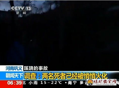 据央视《朝闻天下》报道,河南巩义市大峪沟煤业集团炭煤矿东翼采煤队2013年12月22日发生透水事故,多人伤亡,事故遭瞒报,死者被悄悄火化。