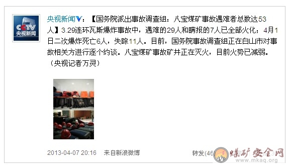 【国务院派出事故调查组:八宝煤矿事故遇难者总数达53人】3.29连环瓦斯爆炸事故中,遇难的29人和瞒报的7人已全部火化;4月1日二次爆炸死亡6人,失踪11人。目前,国务院事故调查组正在白山市对事故相关方进行逐个约谈。八宝煤矿事故矿井正在灭火,目前火势已减弱。(央视记者万灵)