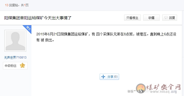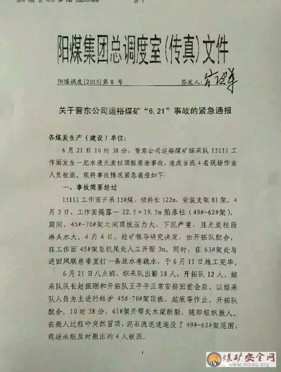 2015年6月21日阳煤集团运裕煤矿,有四个采煤队兄弟在8点班,被埋压。直到晚上6点还没有被救出。