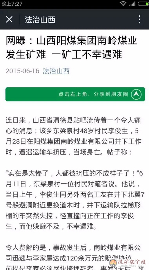 连日来,山西省清徐县贴吧流传着一个令人痛心的消息:该乡东梁泉村48岁村民李俊生,5月28日在阳煤集团南岭煤业有限公司井下工作时,遭遇运输车挤压,当场身亡。帖子称: