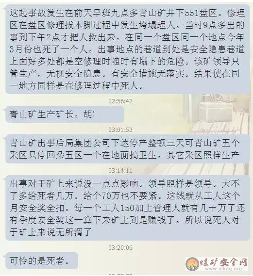 下面是这位网友的爆料的全文。有网友爆料称,12月1日青山煤矿发生一起事故。一位矿工在井下作业时被埋,早上9点多发生的故事,到下午两点钟才把人挖出来。另有网友介绍称,遇难的矿工是湖南籍,出事以后,来了几十个家属。死者的母亲更是多次哭晕了。目前,煤矿和死者家属就相关赔偿进行了商谈。