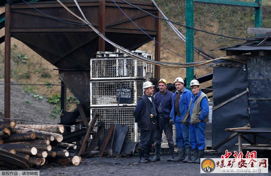 当地时间10月13日,波黑卡卡尼,联邦矿业检查员和矿工站在煤矿入口附近。四名煤矿工人在夜间的事故中丧生,两人受伤。