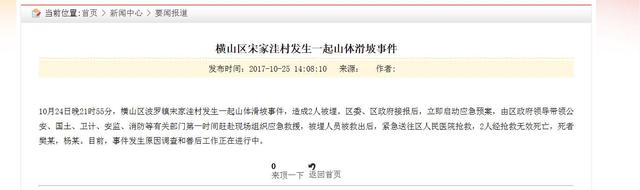10月24日晚21时55分,横山区波罗镇宋家洼村发生一起山体滑坡事件,造成2人被埋。区委、区政府接报后,立即启动应急预案,由区政府领导带领公安、国土、卫计、安监、消防等有关部门第一时间赶赴现场组织应急救援,被埋人员被救出后,紧急送往区人民医院抢救,2人经抢救无效死亡,死者樊某,杨某。目前,事件发生原因调查和善后工作正在进行中。