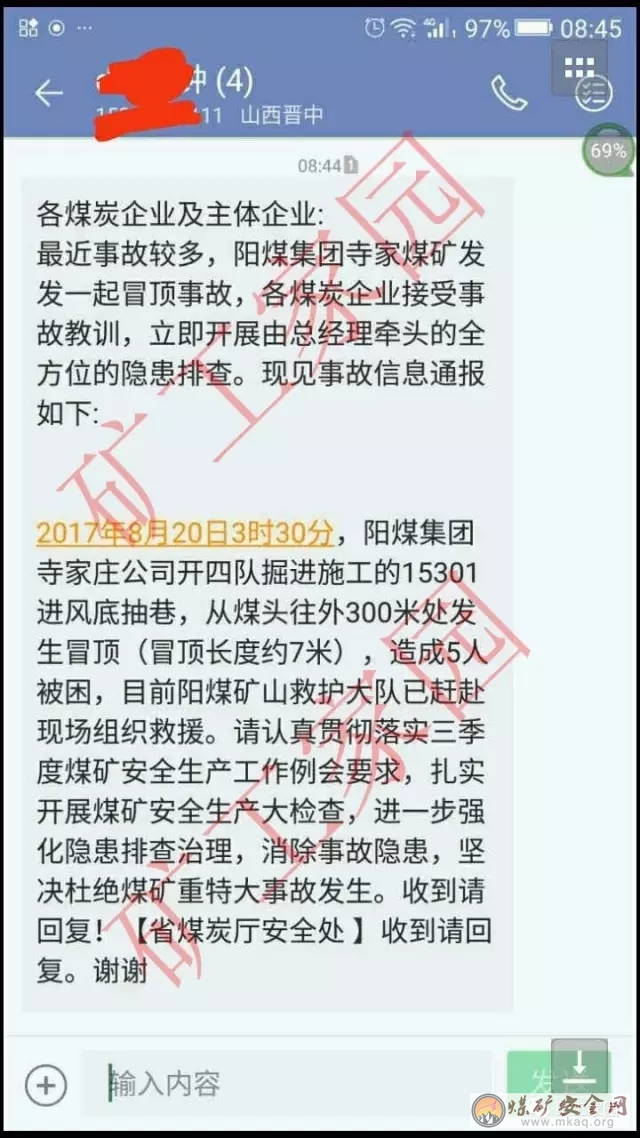 2017年8月20日3时30分阳煤集团寺家庄公司开四队发生冒顶事故造成5人被困。