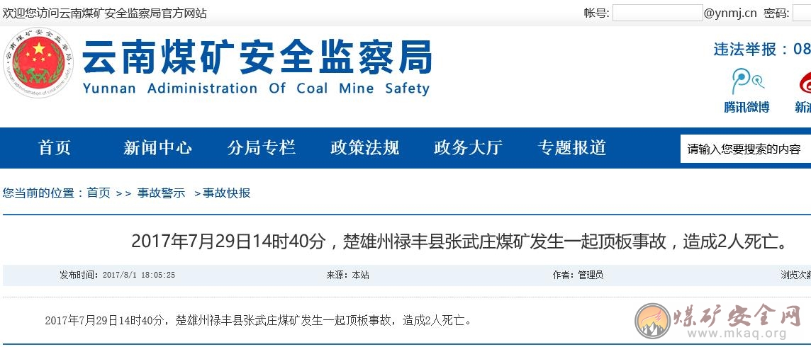 7月29日14时40分,楚雄州禄丰县张武庄煤矿发生一起顶板事故,造成2人死亡。